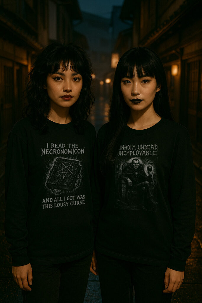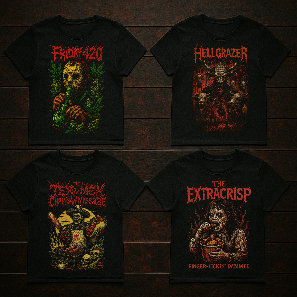 T-shirts are used as a low-commitment surface for testing visual ideas. Many designs are reduced to a single motif, symbol, or phrase, often paired with distressed textures or minimal compositions. The format allows for quick iteration and a direct relationship between image and viewer, making it well suited for humor, irony, and references that work through recognition rather than explanation.